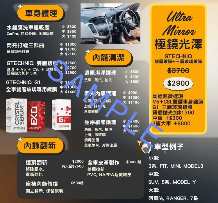我們是汽車美容專業護理公司,致力於維持車輛的機械性能,同時全面重視車廂與車身的深度護理。我們引進先進的汽車美容材料、精密設備及專業技術,為車主提供可靠而高水準的美容服務。多年來不斷鑽研各類車身保護方案,憑藉熟練的打蠟、拋光與清潔技術,能有效修復車漆光澤,使愛車重拾亮麗外觀,煥然一新,倍添品味。我們堅守合理收費原則,不設會員費、套餐綑綁或任何隱藏費用,以最簡單直接的方式為您守護愛車。 此外,我們亦提供專業諮詢,根據車輛狀況為客人制定合適的護理方案,讓每位車主都能享受到細緻貼心的服務。誠意邀請您蒞臨位於紅磡榮光街35號的店鋪,或致電預約打蠟及深層護理服務,讓您的座駕再度展現耀眼光彩。